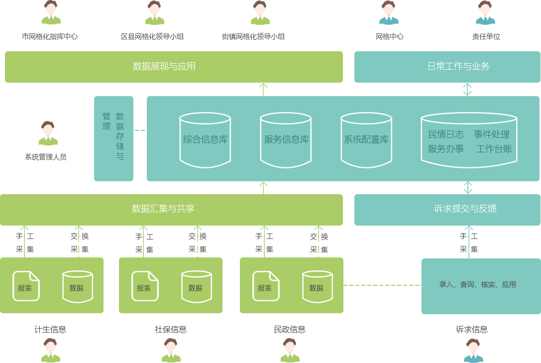構(gòu)建社會管理綜合信息指標(biāo)體系,采集基層各社會管理數(shù)據(jù),匯聚整合各職能部門數(shù)據(jù),實現(xiàn)主要管控重點人口、流動人口、重點組織、重點場所等社會管理數(shù)據(jù)的信息資源數(shù)據(jù)庫建設(shè)。